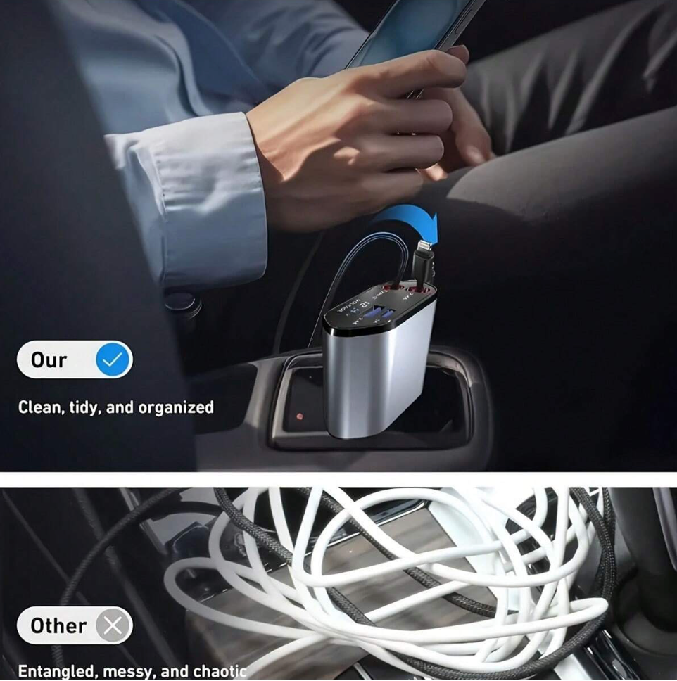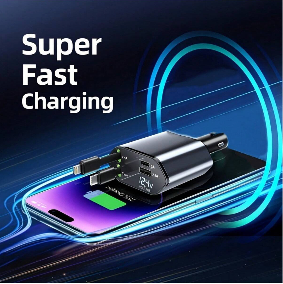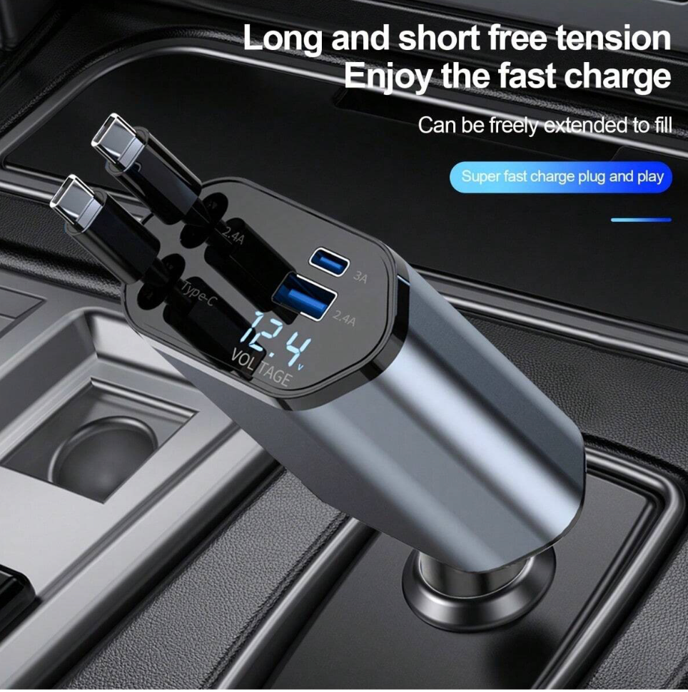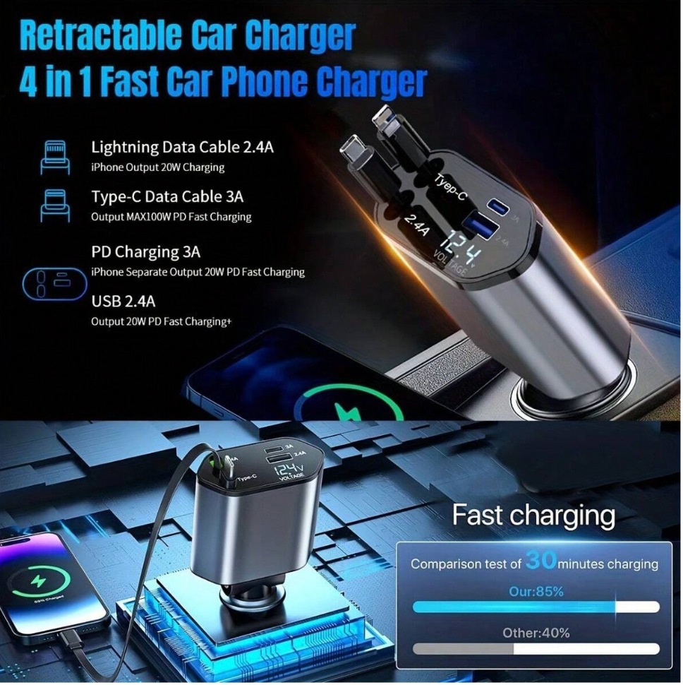 Stay Powered on the Go with the Retractable 4-in-1 Fast Car Charger!